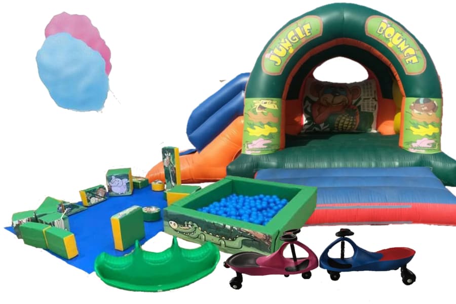 Jungle Bounce Bouncy Castle, Toddlers Jungle Soft Play set, Ball Pool, Rocker, Tunnel and Candy Floss Party Package.